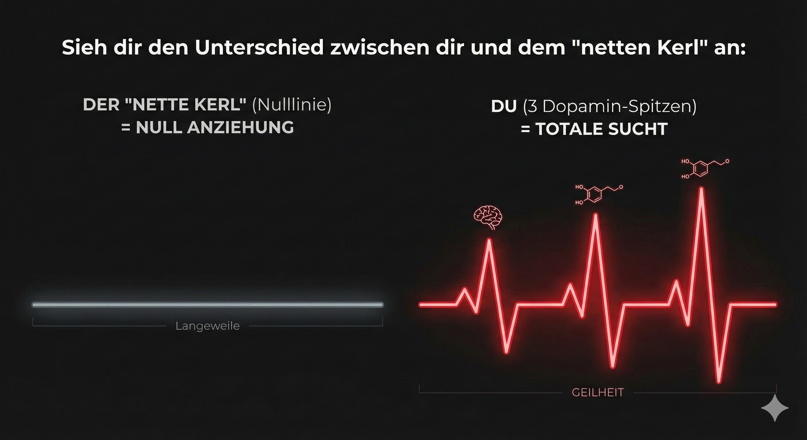 Fang noch HEUTE an, Emotionale Spitzen (Dopamin-Kicks) zu erzeugen und bemerke die sofortige Veränderung: Selbst die kälteste oder “unerreichbarste” Frau wird anfangen, dir mit Verlangen und Dringlichkeit zu antworten.